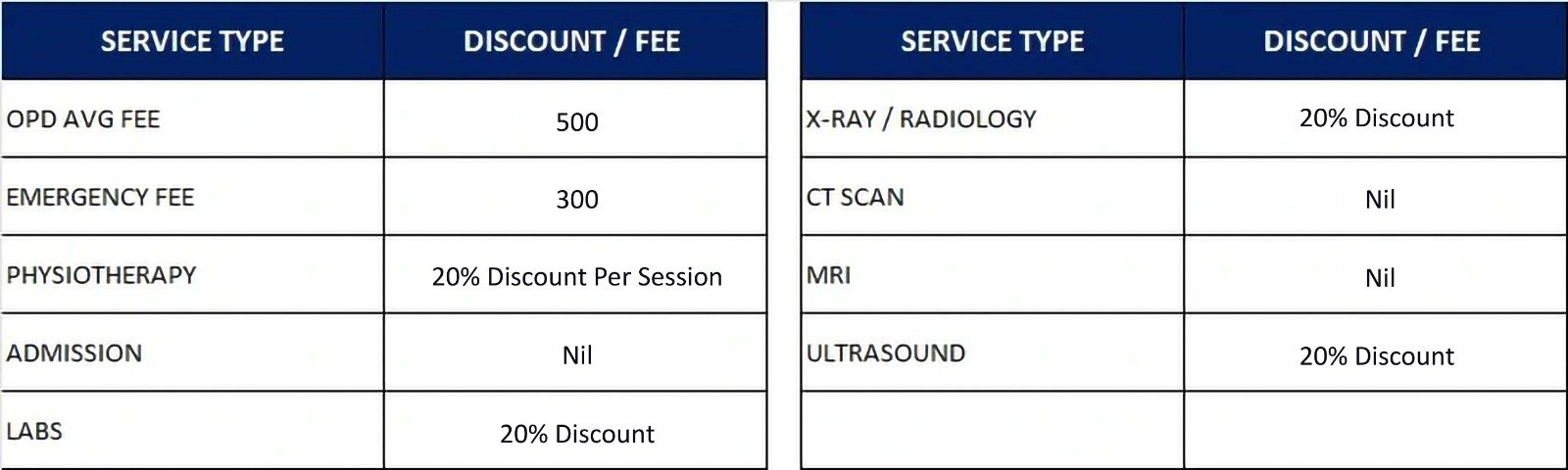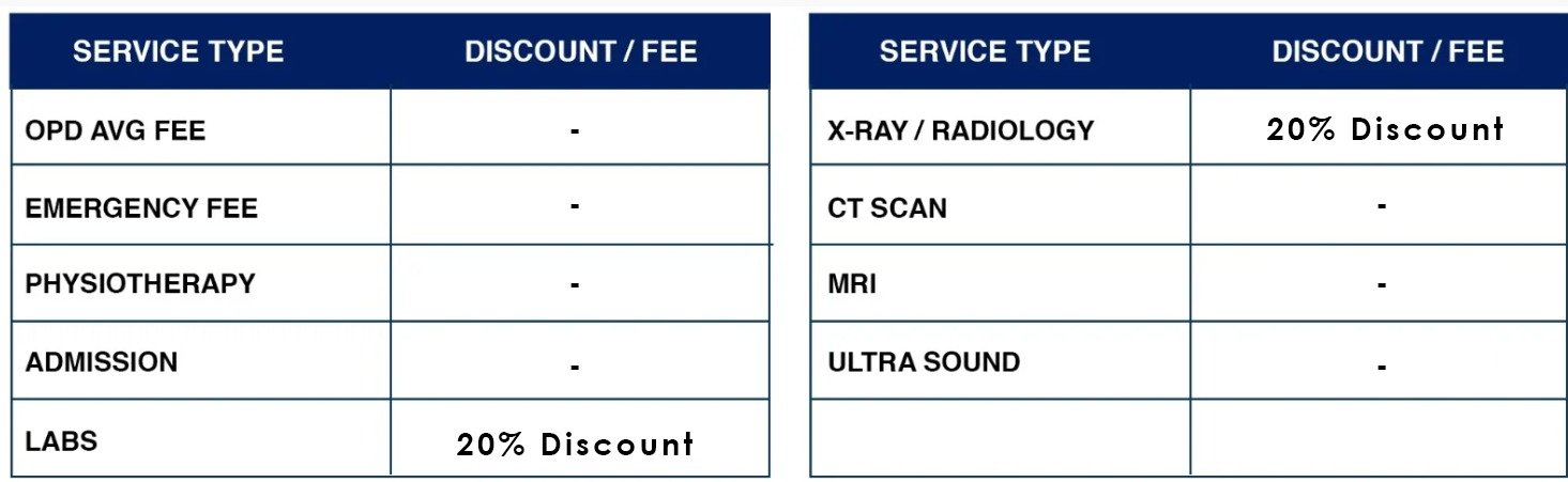 درج ذیل ہسپتال اورلیب سے رعایت حاصل کرنے کے لیئے کاؤنٹر پر اپنا ہیلتھ کارڈ اور شناختی کارڈ ( کارڈ یا اسکی کاپی) دیکھائے ، شکایت کی صورت میں اس نمبر 5206206-0300 , 03392002579 پر رابطہ کریں۔