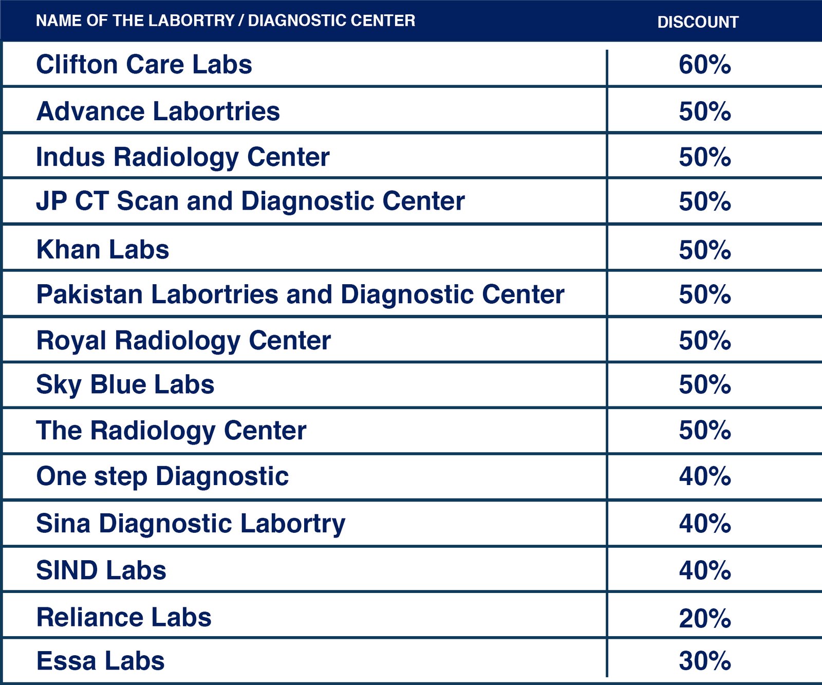 درج ذیل ہسپتال اورلیب سے رعایت حاصل کرنے کے لیئے کاؤنٹر پر اپنا ہیلتھ کارڈ اور شناختی کارڈ ( کارڈ یا اسکی کاپی) دیکھائے ، شکایت کی صورت میں اس نمبر 5206206-0300 , 03392002579 پر رابطہ کریں۔